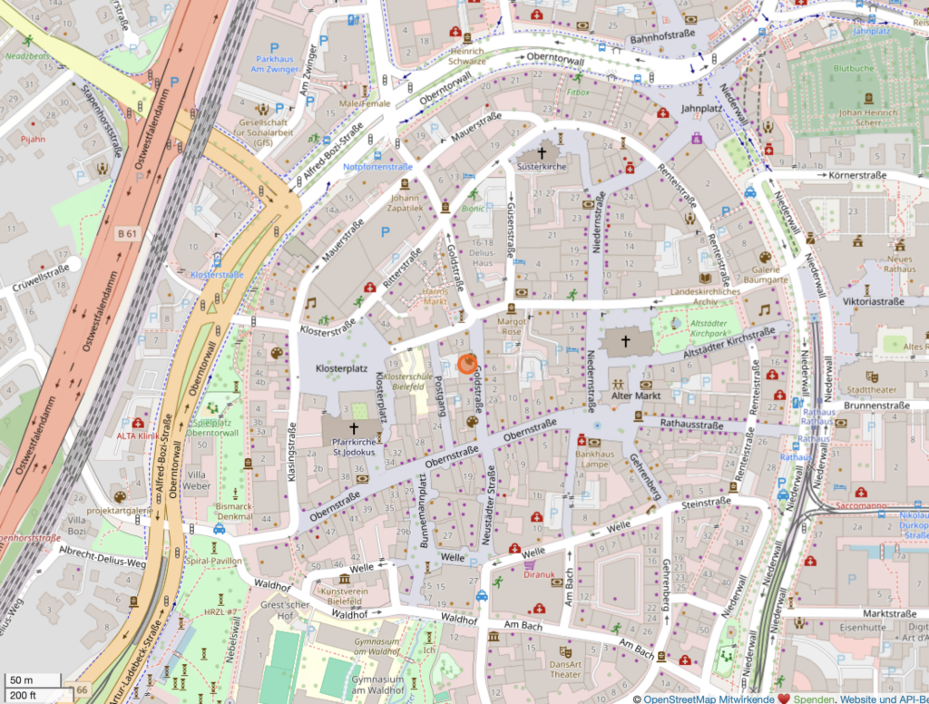 Die Praxis finden Sie in der Bielefelder Innenstadt. Im Umkreis befinden sich verschiedene Haltestellen öffentlicher Verkehrsmittel (z.B. Jahnplatz oder Rathaus) und Parkhäuser.